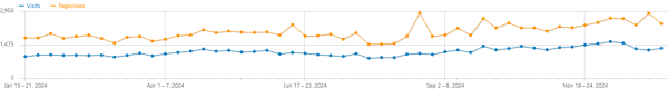 Below is a chart where each data point corresponds to one week: for example, during the week of 2–8 September, we had 1,156 visits and 1,896 pageviews.