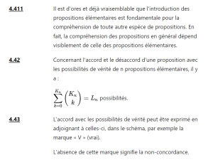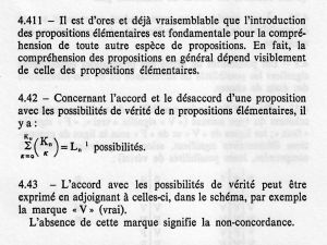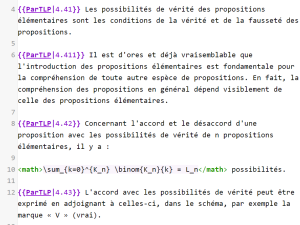 The first image is a scan from the Gallimard edition of Wittgenstein’s Tractatus logico-philosophicus, translated by Gilles-Gaston Granger. The second image is the MediaWiki source code of the corresponding Ludwig Wittgenstein Project transcription (in addition to typical MediaWiki markup, such as the {{}} syntax for templates, the relatively complex proposition 4.42 includes LaTeX markup within the <math></math> tags). The third image is the Ludwig Wittgenstein Project’s transcription as viewed in a web browser. The processes that lead from the first picture to the second (encoding) and from the second to the third (rendering) are both 1-to-1 substitutions (images in the Tractarian sense).
