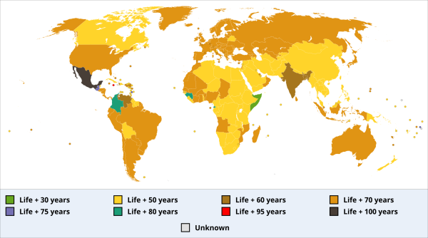 This map provides a simplified overview of the duration of copyright terms worldwide. Please note that in some countries, for example the US, copyright laws are more complex than elsewhere and knowing that a given number of years has passed since an author’s death is not sufficient for determining the copyright status of their works; in the US, in particular, the publication date of a work often influences its copyright status.[5] Moreover, even in those cases where a country’s copyright term is a definite period after the author’s death, exceptions may extend copyright further; in France, for example, where the duration of the copyright term is 70 years P.M.A., copyright lasts longer for those authors who died at war and officially count as morts pour la France—among them, famously, Antoine de Saint-Exupéry.[6]